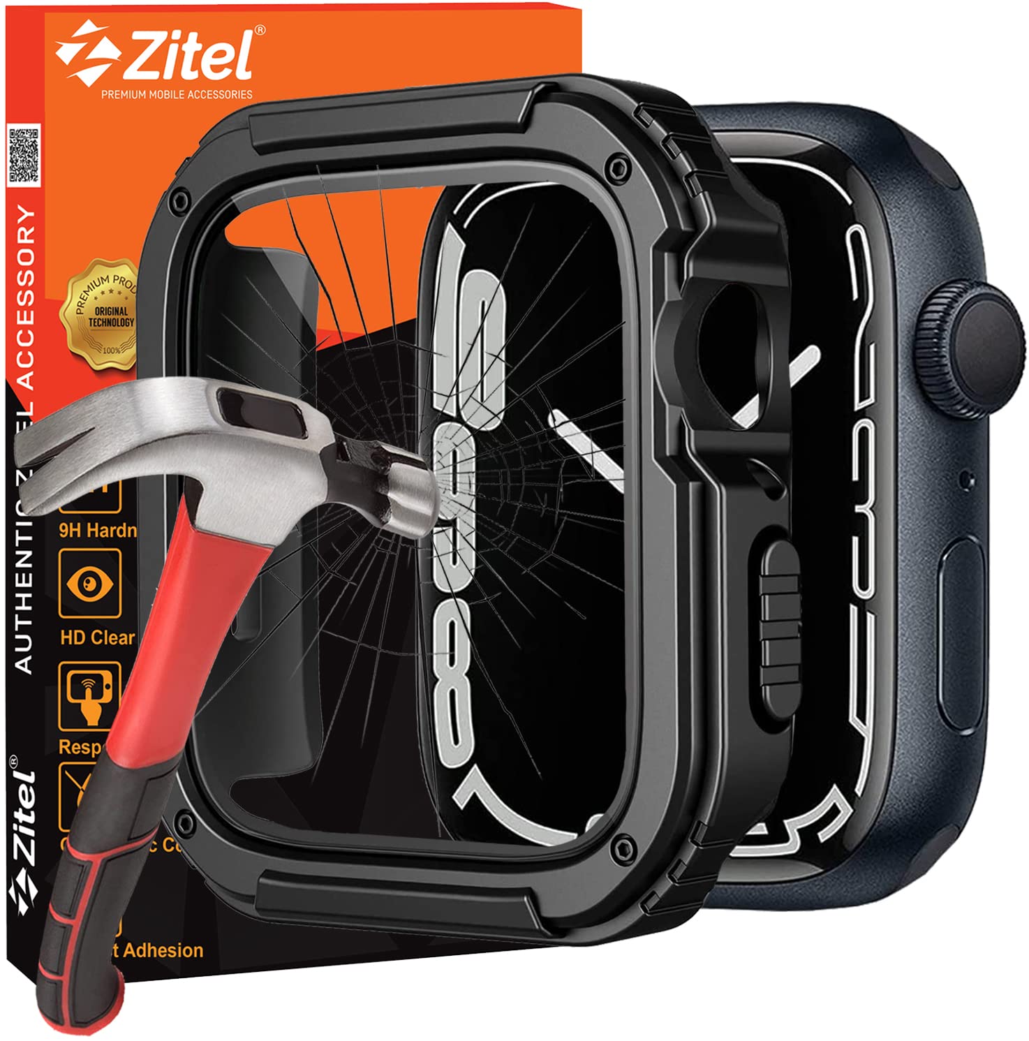 Zitel Rugged Case for Apple Watch Series 9 / 8 / 7 45mm Screen Protector Case with Built-in 9H Tempered Glass - Black