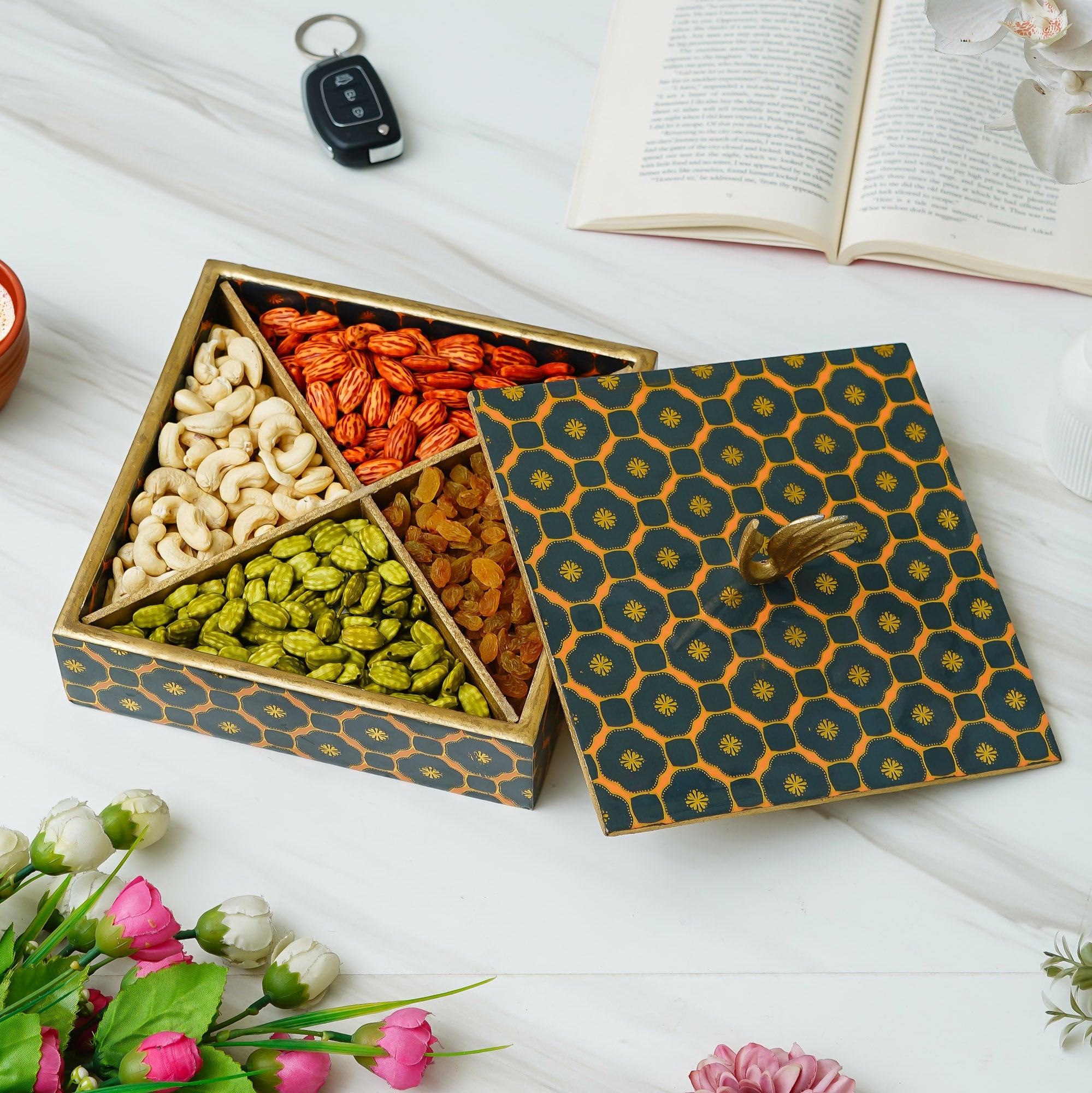 Webelkart Premium Enamel Coated Dry Fruit Container Set With Serving Tray & Lid For Dining Table,Dry Food Box,Serving Set with 4 Section/y (8" Inches)