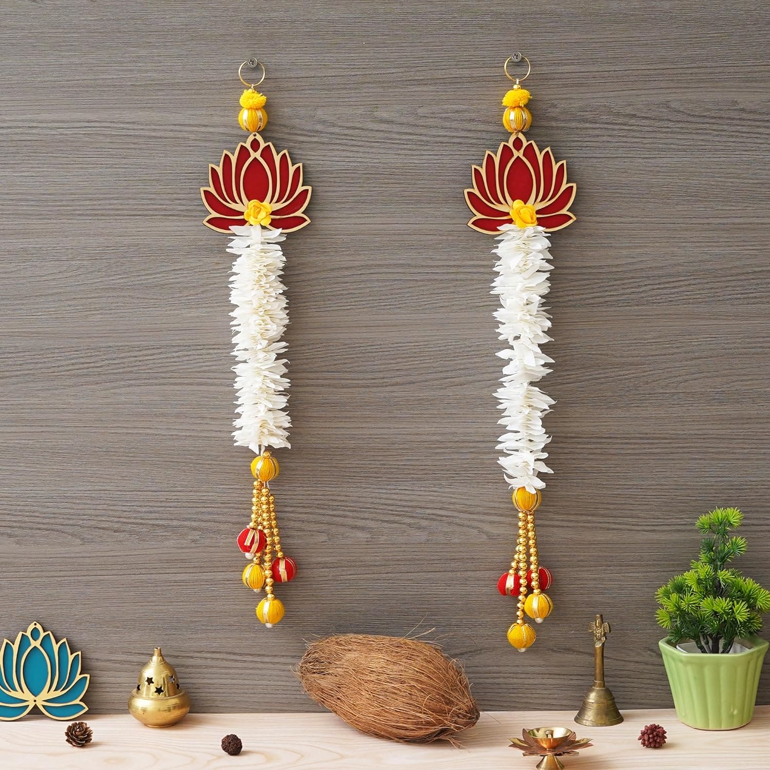 JaipurCrafts Premium White and Gold Lotus Wall Hanging Wall Decor |Temple Decor Home and Office Decor| Lotus Back Drop Hanging (Set of 2) (Red)