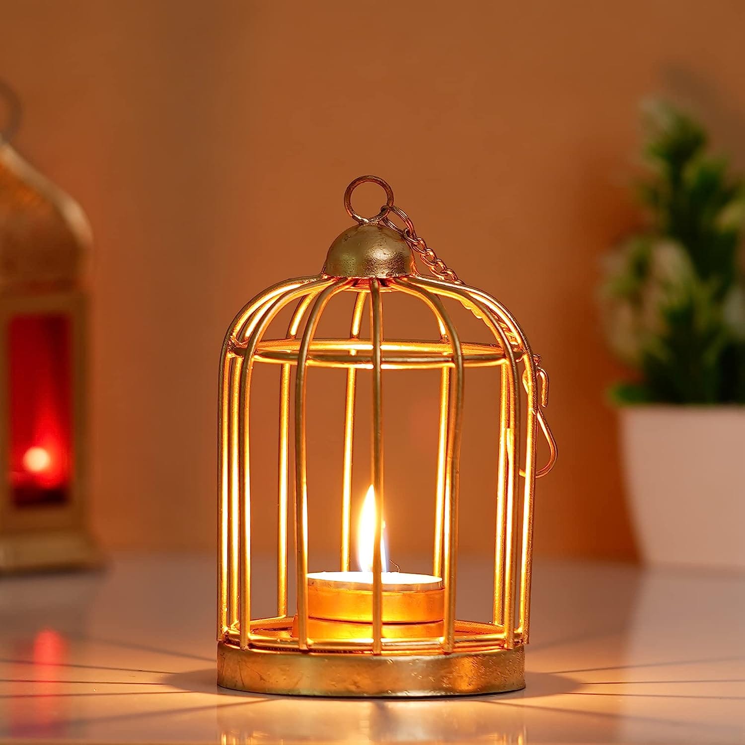 JaipurCrafts Gold Color Metal Iron Bird Cage Tea Light Holder with Diwali Diya Light Free Tealight Candle Holder for Home| Tealight Holder for Home and Diwali Decoration (4 Inches, Gold)