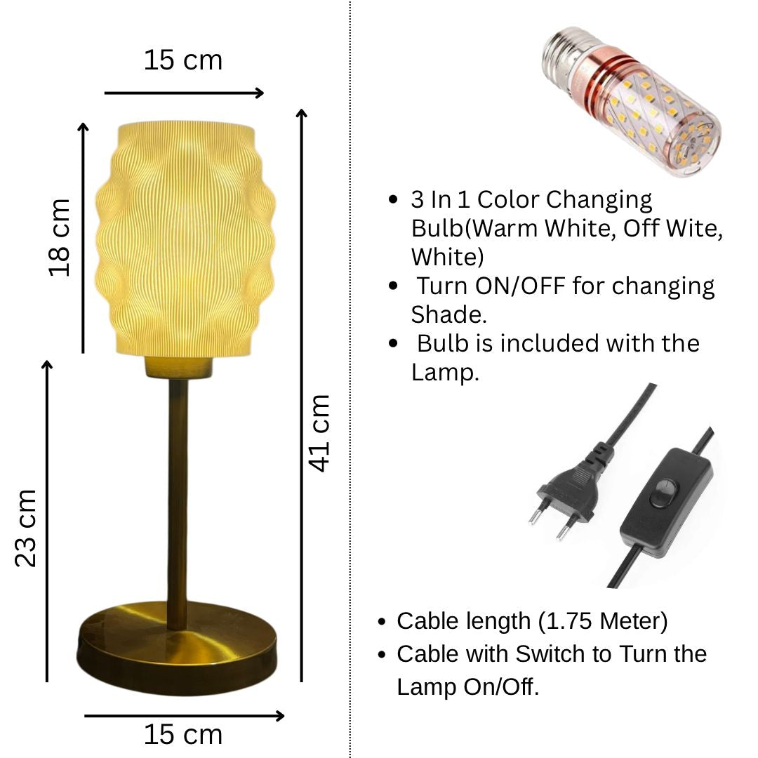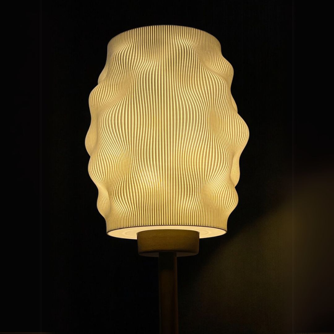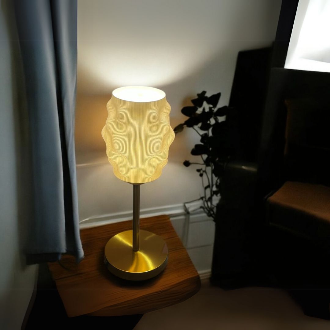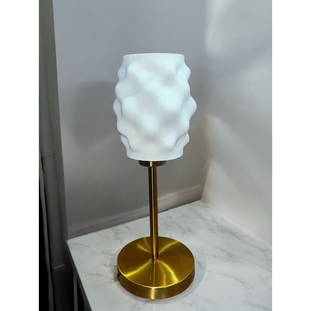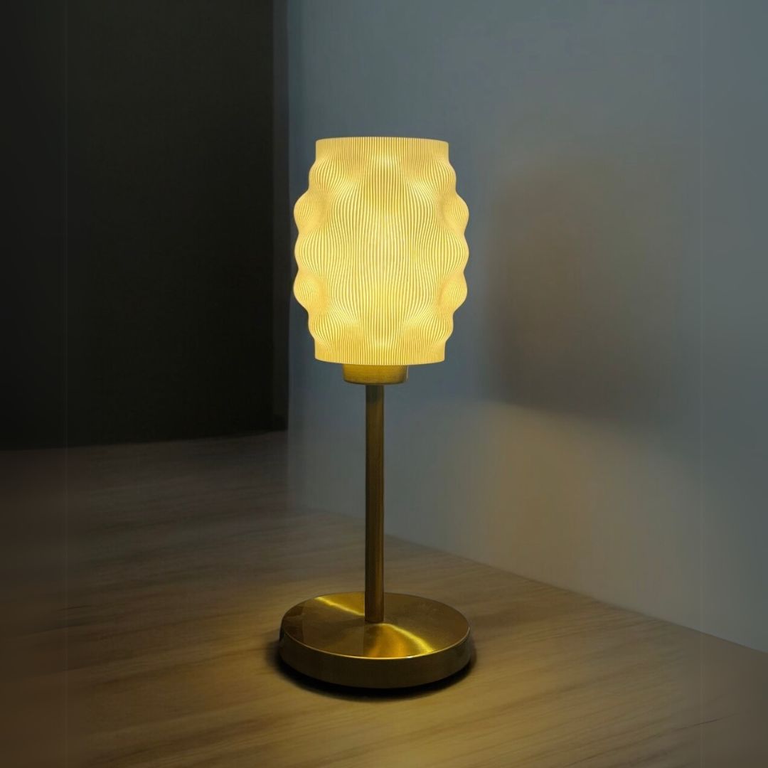 Elegant 3D-printed table lamp, Aura Lite Table Lamp with a sculptedwavy shade and gold metal base, perfect for adding warmth and modern charm to bedside orliving spaces.