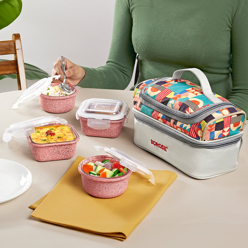 Borosil Kube Pink Universal Glass Lunchbox, 320ml x 2 + 240ml x 2