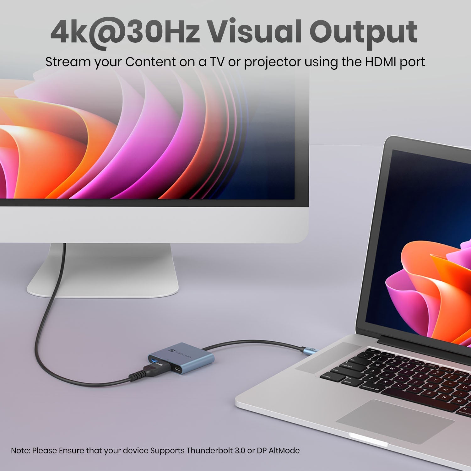 - 3-in-1 USB-C Hub: The Portronics C-Konnect Plus, a Type-C hub with 1 HDMI (4K @ 30Hz) port, 1 USB-A (3.0) port, and 1 PD Type-C (100W) port. These 3 ports can be used simultaneously for the ultimate multi-tasking.