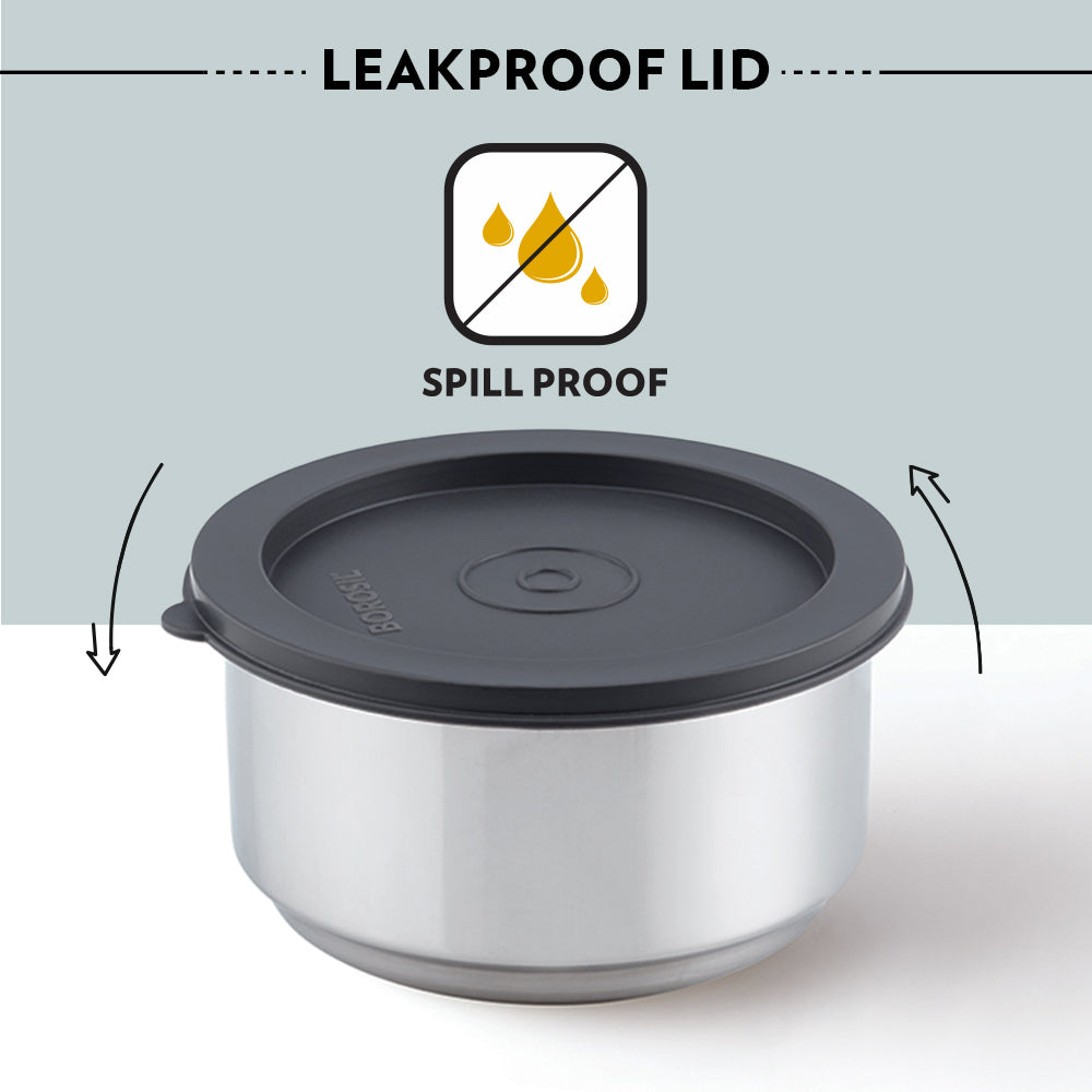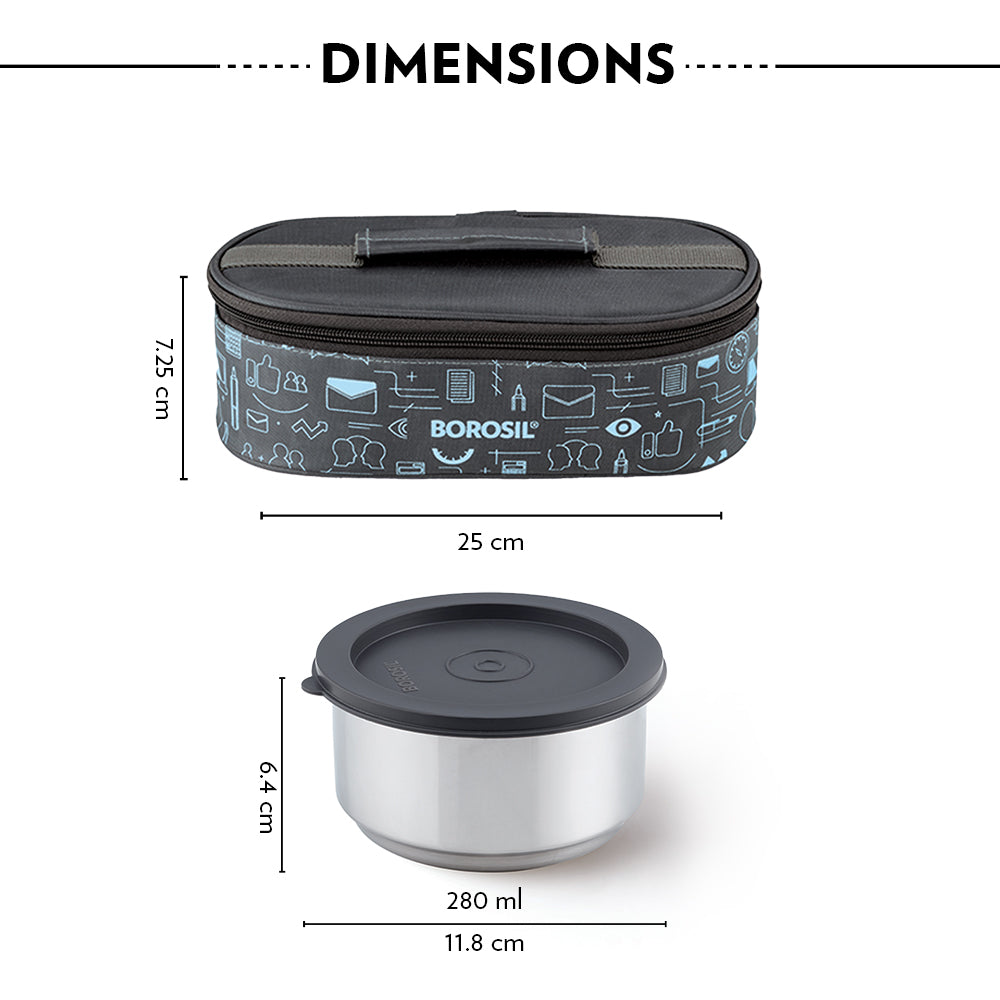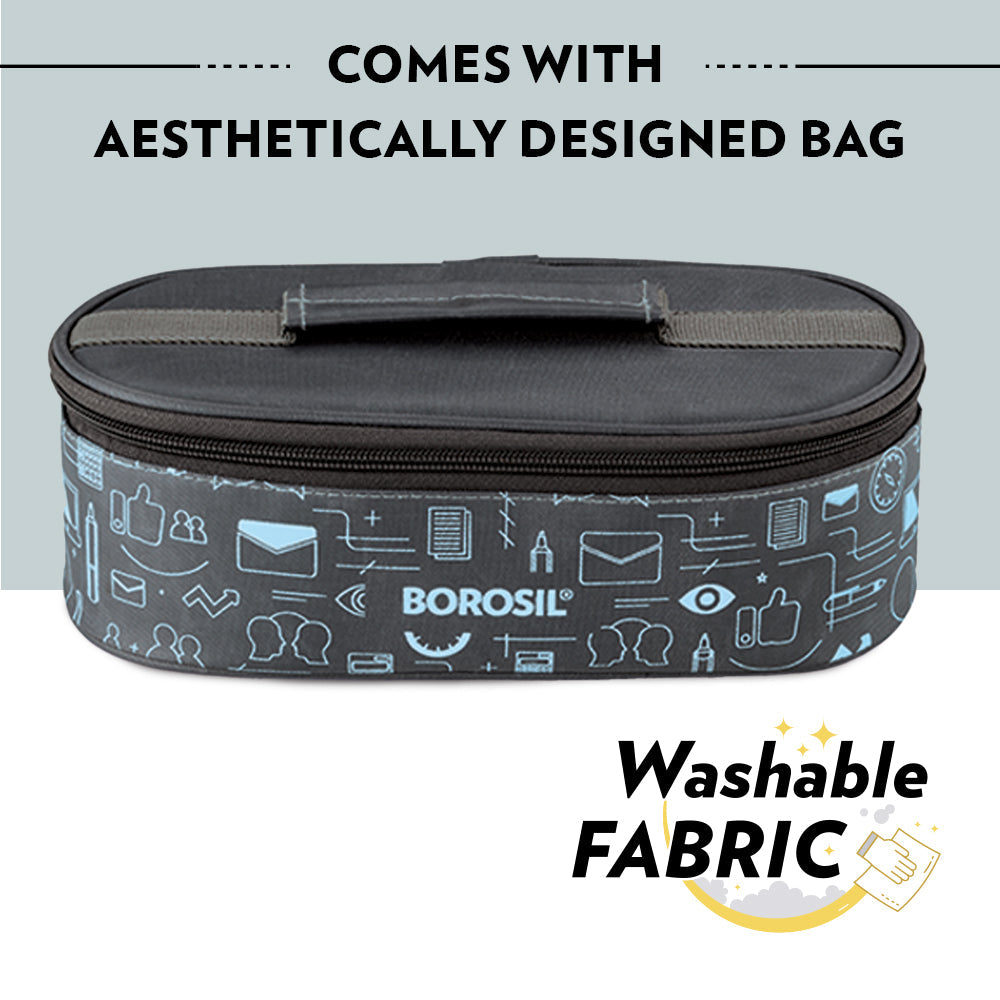 The Carry Fresh stainless-steel insulated lunch box, comes with double wall insulated containers which keep your food fresh. A plate on the containers can be used for serving the accompaniments to make your meal tastier. An attractive grey bag with doodles adds an element of fun to your everyday. Light and convenient, now enjoy every lunch in the office with Borosil's Carry Fresh Lunch boxes!