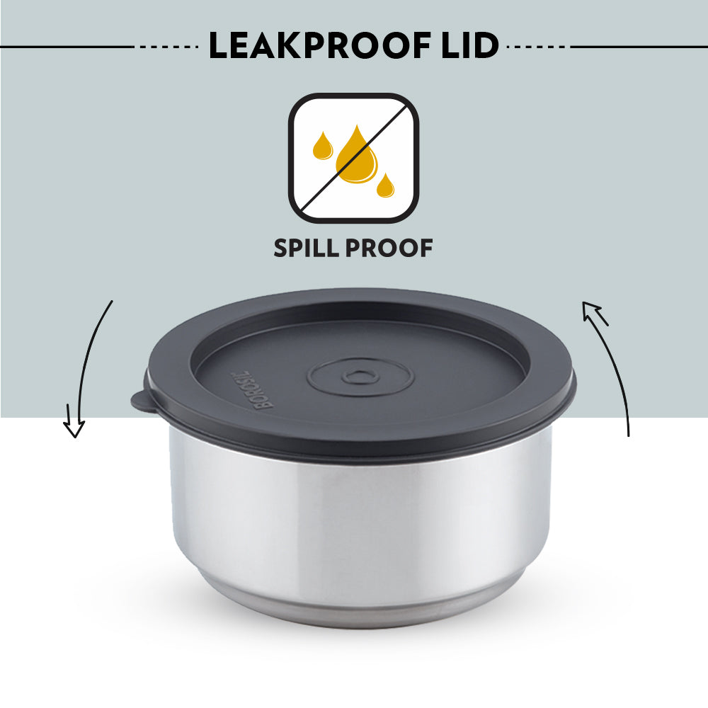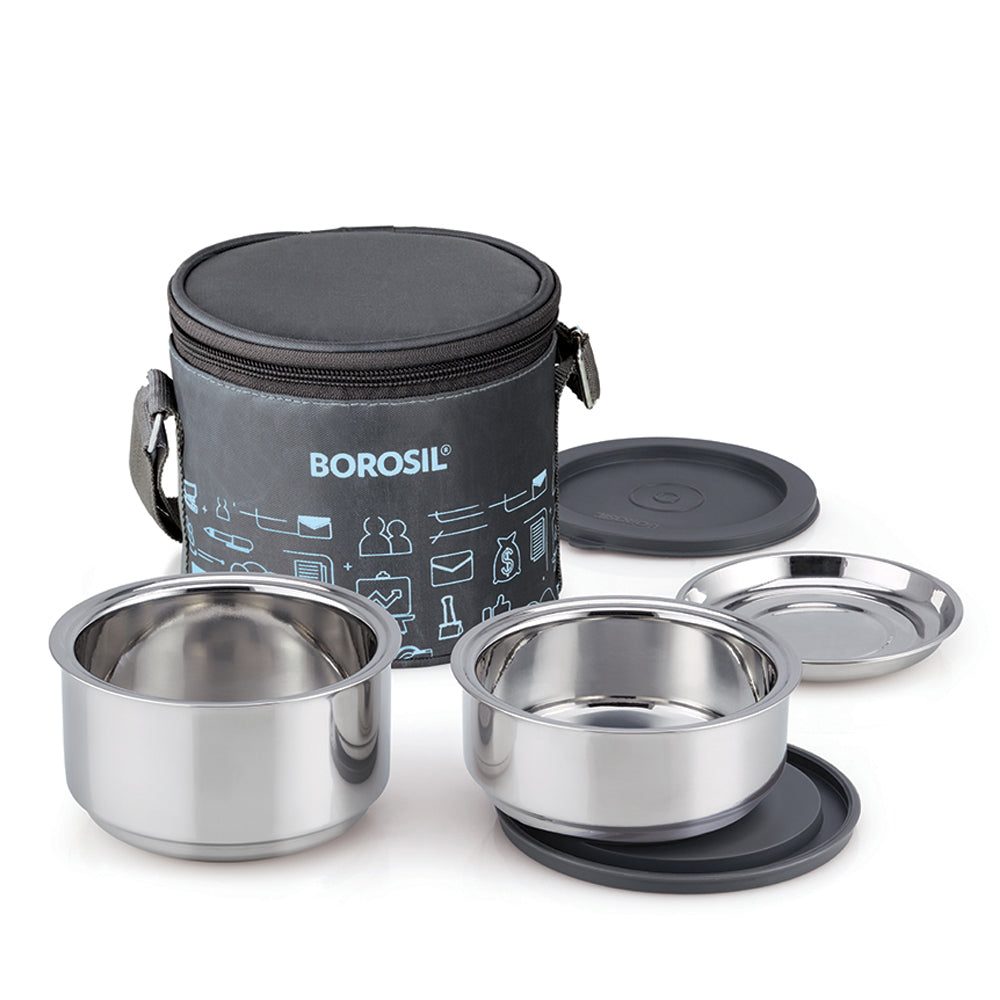 The Carry Fresh stainless-steel insulated lunch box, comes with double wall insulated containers which keep your food fresh. A plate on the containers can be used for serving the accompaniments to make your meal tastier. An attractive grey bag with doodles adds an element of fun to your everyday. Light and convenient, now enjoy every lunch in the office with Borosil's Carry Fresh Lunch boxes!