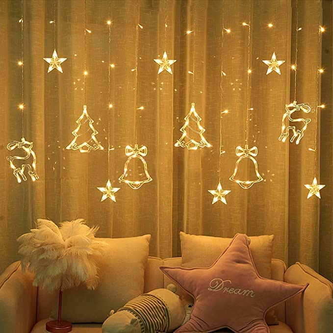 - High-Quality Window Curtain String Lights: The pattern including Christmas tree, stars, elk, the bell lights adopts laser engraving technology, with clear texture, smooth lines, and no burr. the string is 350 cm long