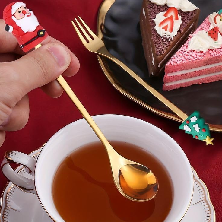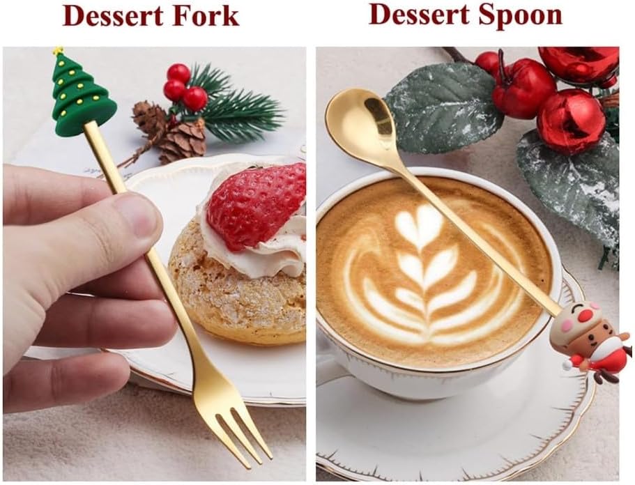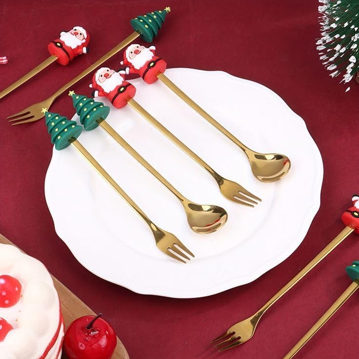 Christmas theme design, the christmas theme dinnerware kit has christmas elements on spoons and forks, snowflake, christmas tree, gift box and more.