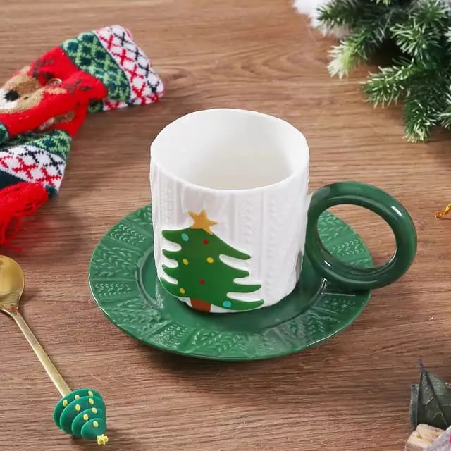 - High-quality ceramic mug with a delightful Christmas Tree design, accompanied by a festive Green saucer.