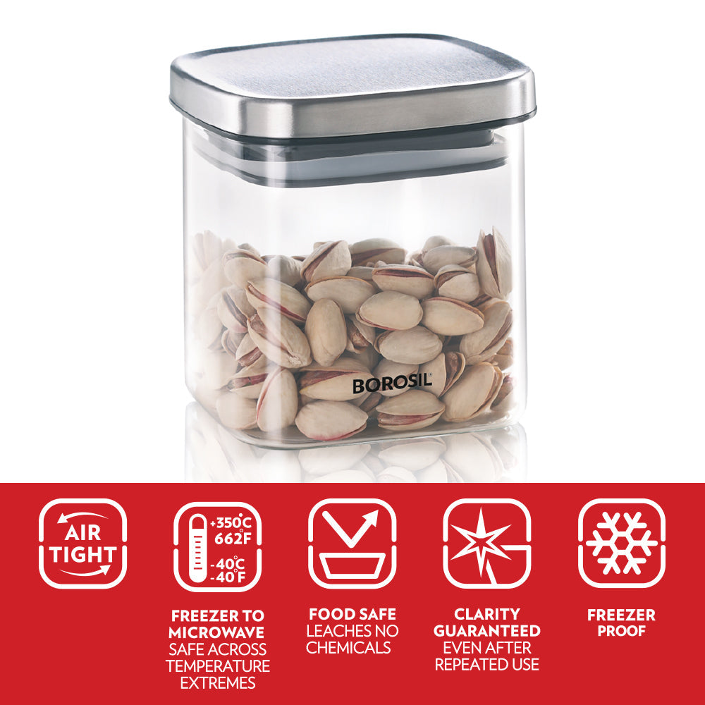 A practical twist to the original Classic Jar, the square shaped variant is designed to save precious space in your kitchen. Use it to store pulses and grain, or dry fruits and snacks - the inert borosilicate glass ensures that your food stays 100% pure. Since the jars are flame proof, it is easy to thaw the contents. If you like our original Classic Jar, you are sure to love this one as well!