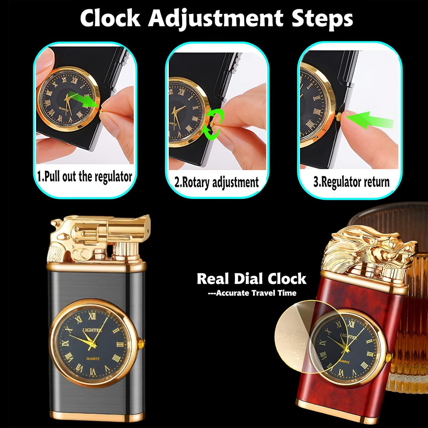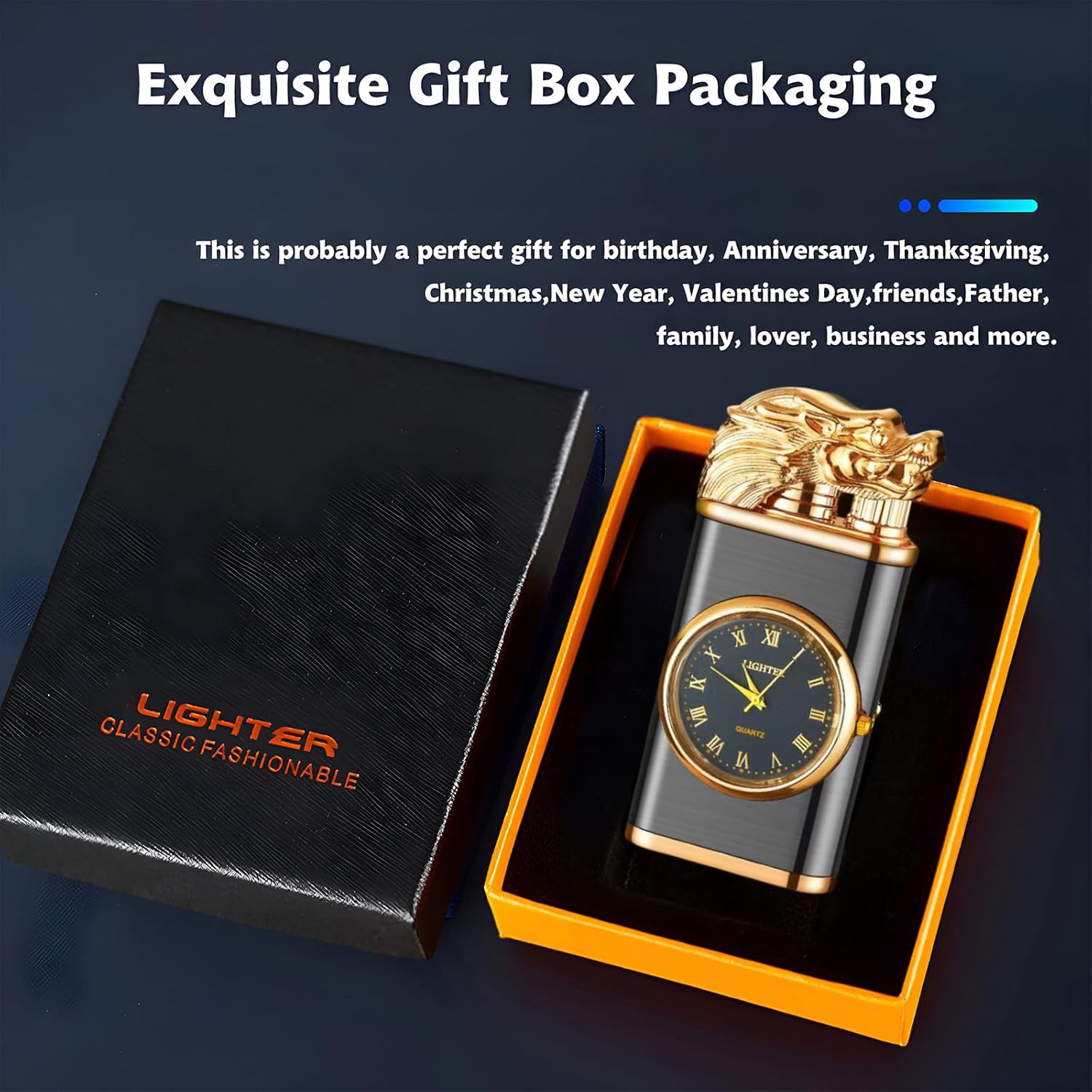 Draco: Windproof Dual Flame Refillable Lighter with Built-in Watch, Dragon Embossed Design & Bold Metal Finish for Collectors & Gifting