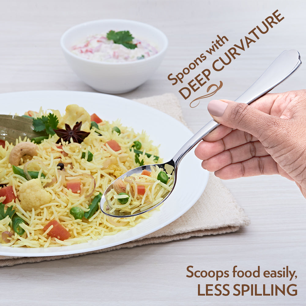We all know that the right tools can make a world of difference and these stainless steel dinner spoons are no exception. Made to withstand the rigours of daily use, they are perfect for enjoying everything from dals and curries to soups and stews. And with their sleek and modern design, they'll look great on any table. So go ahead, upgrade your tableware game and make mealtime a little more special with these durable and stylish spoons.