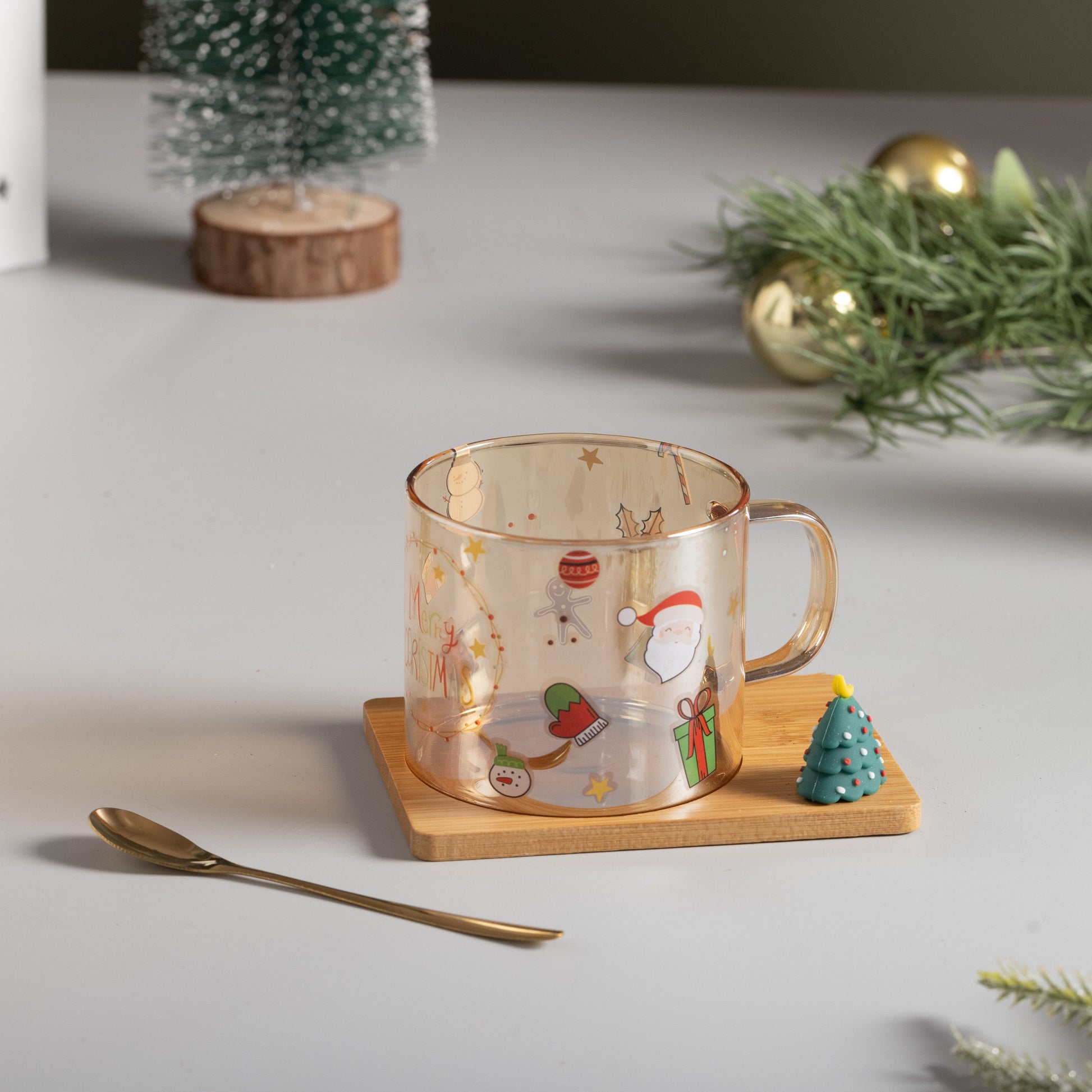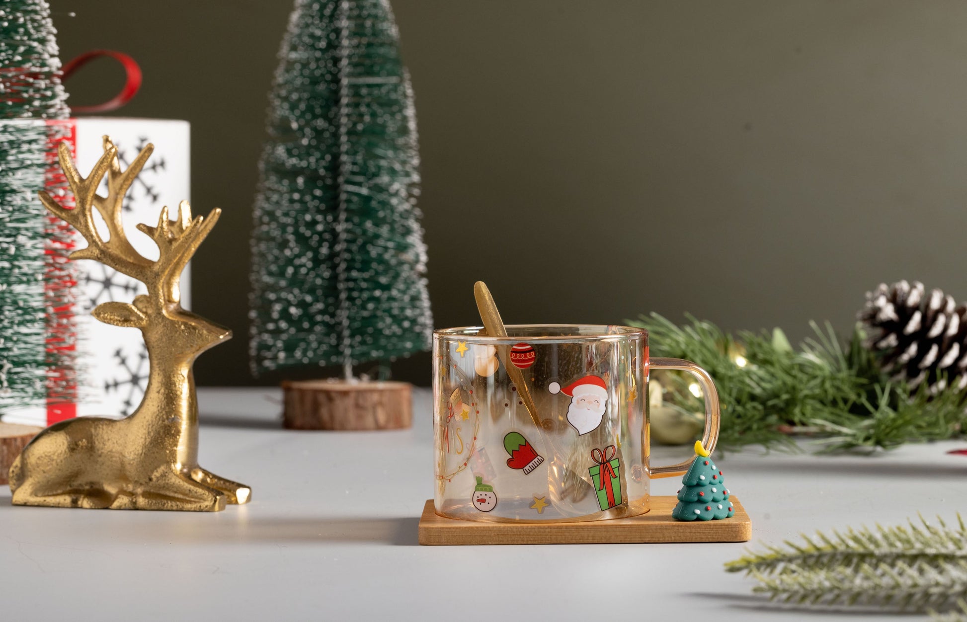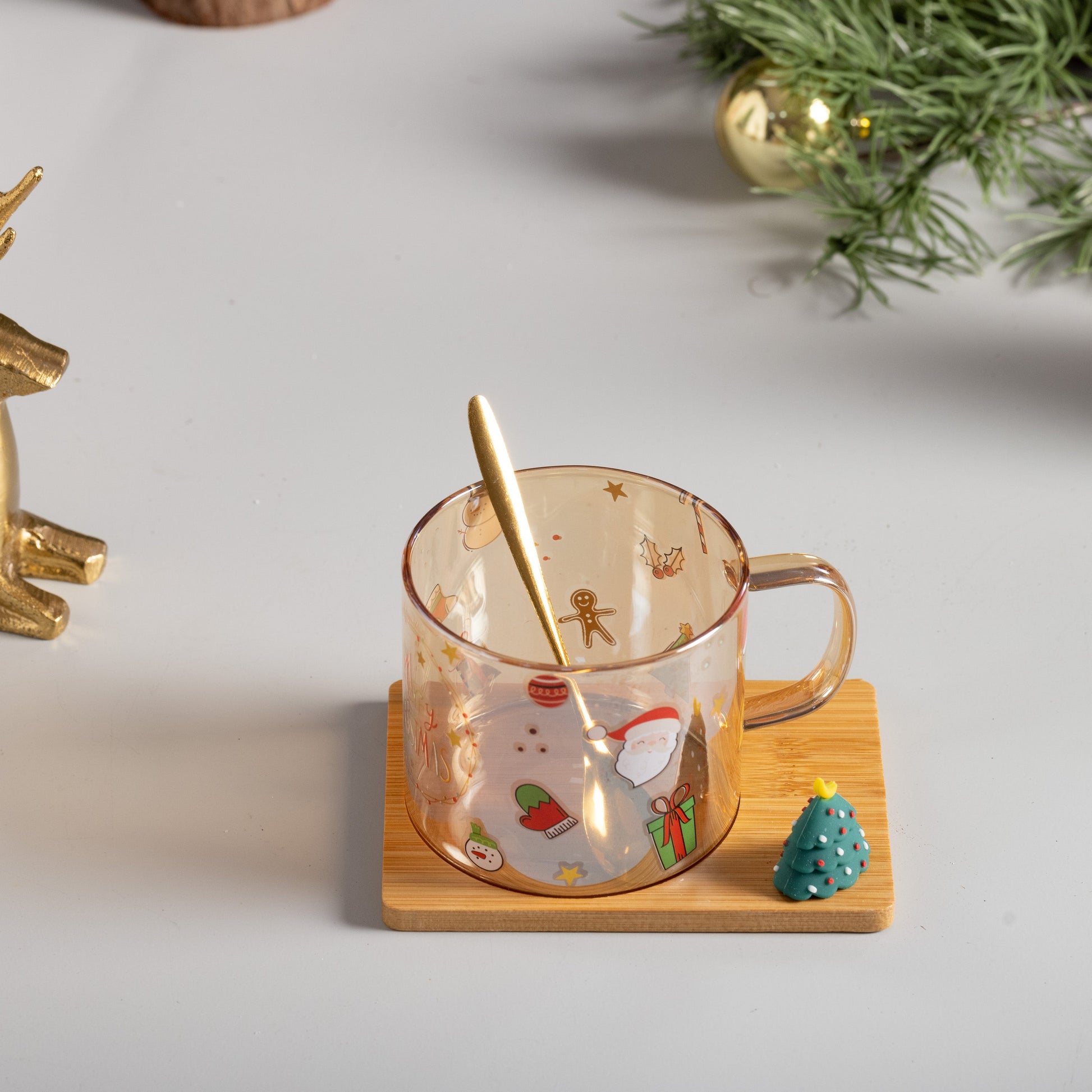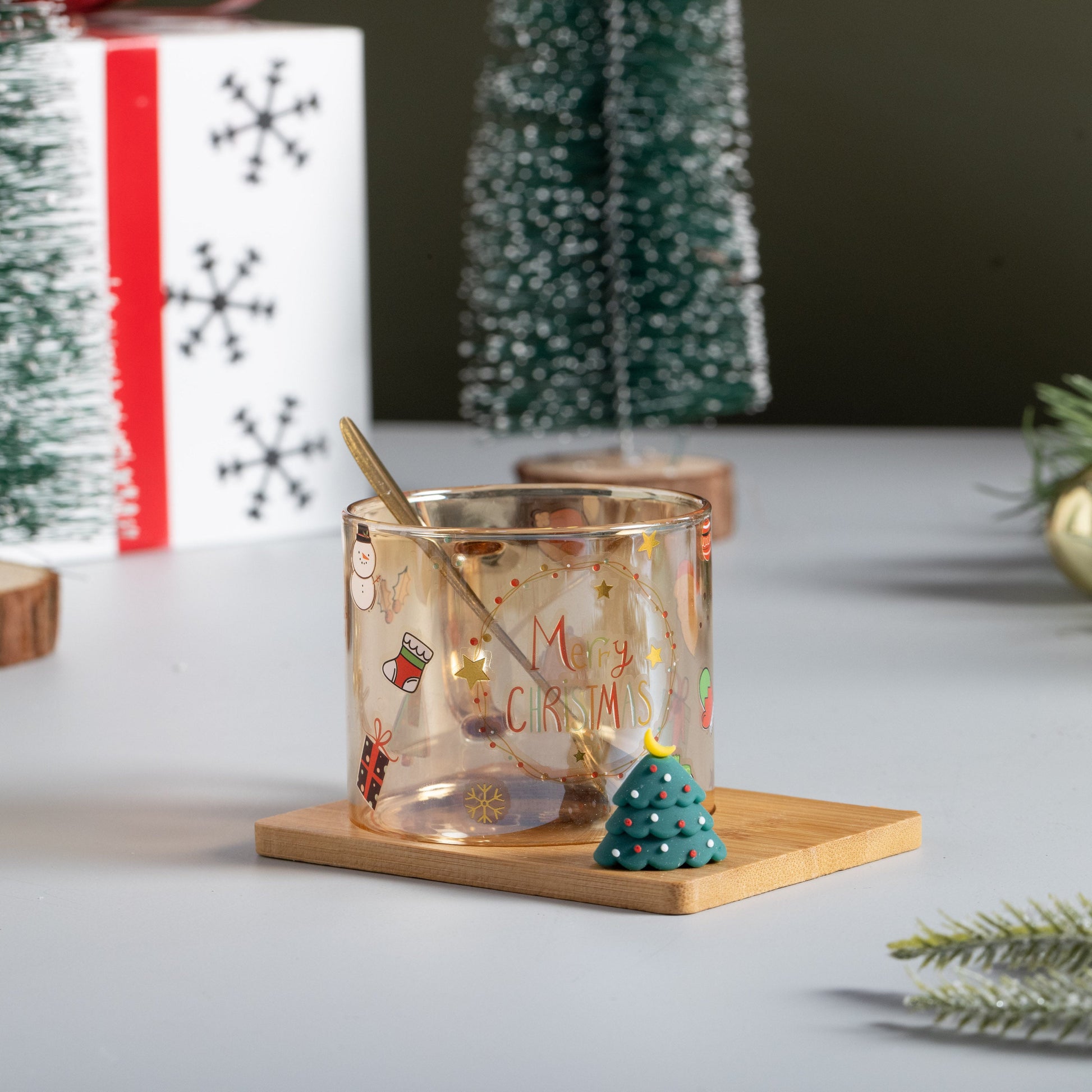 This Christmas now drink your tea/coffee in this beautiful Christmas print Glass mug that comes with Wooden plate and golden Spoon- The wooden tray has cute Christmas style Silicon-