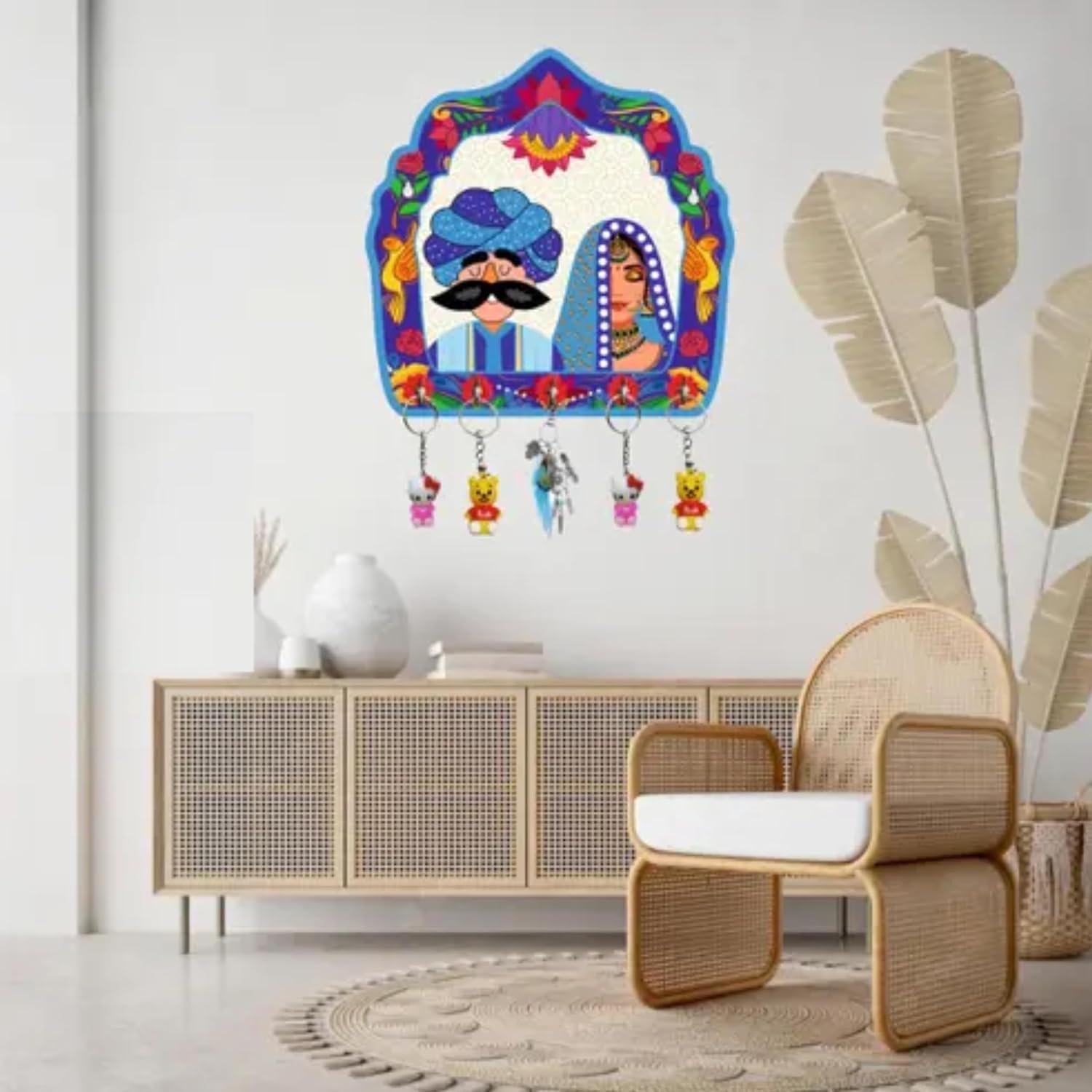 JaipurCrafts Premium Welcome Lady Rajasthani Wooden Key Holder for Home and Office Decor, Key Chain Holder for Home and Living Room (8 inches , Blue)