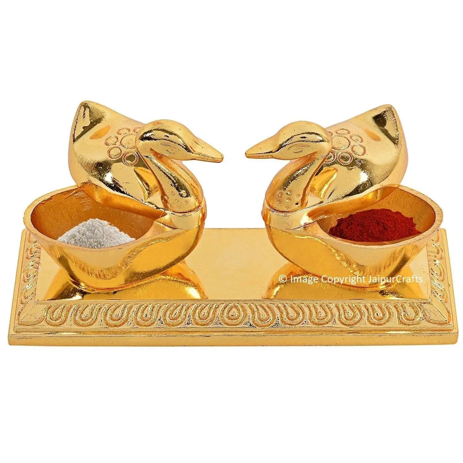 JaipurCrafts Zinc Roli-Chandan, Chawal-Akshat-Haldi, Kumkum Box with Loving Bird Duck Pair Chopda, 11x6x3cm(Gold)