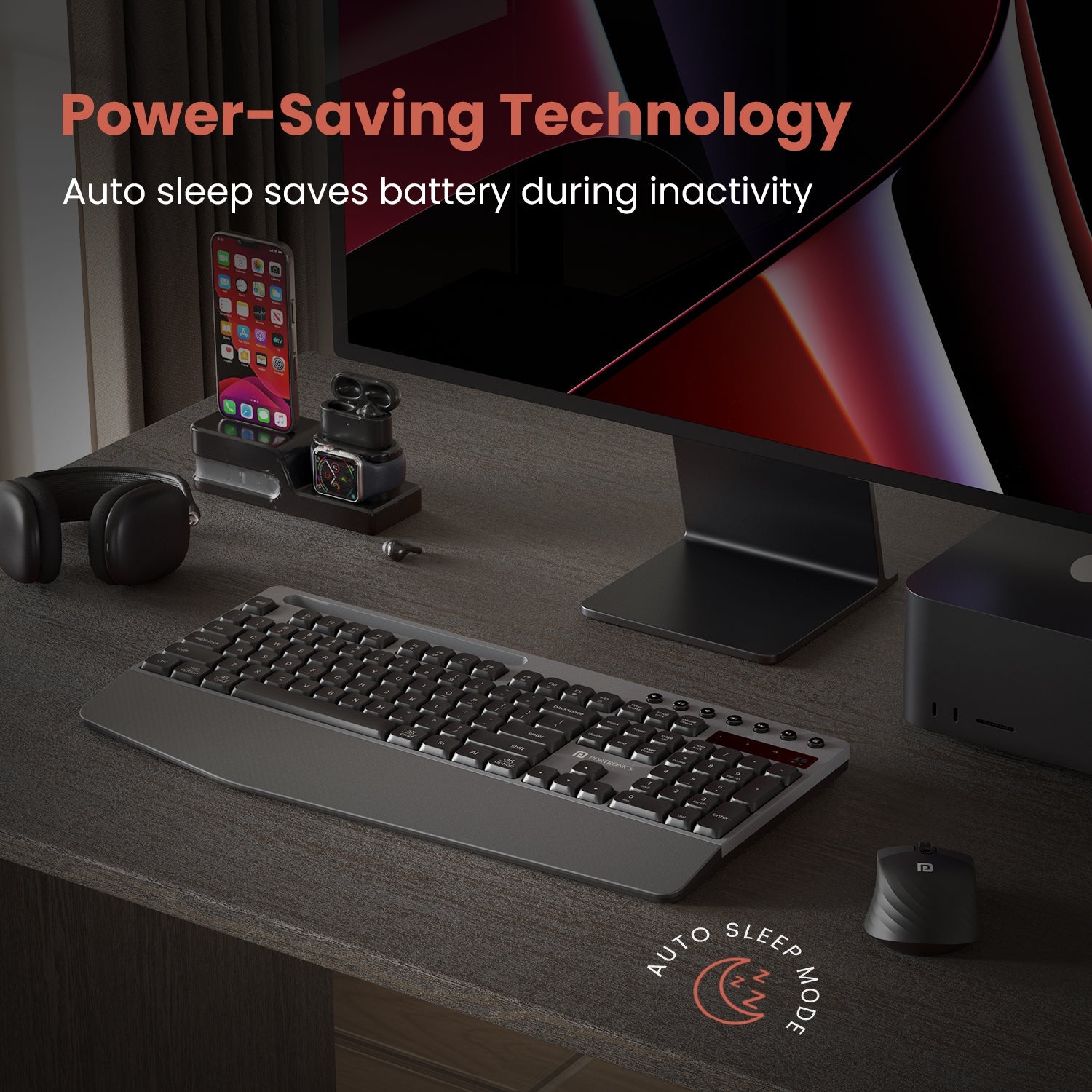 - Wrist-Rest Comfort : Designed for long work sessions, the keyboard includes a built-in wrist rest that provides enhanced support, helping reduce wrist strain and fatigue during extended typing periods.