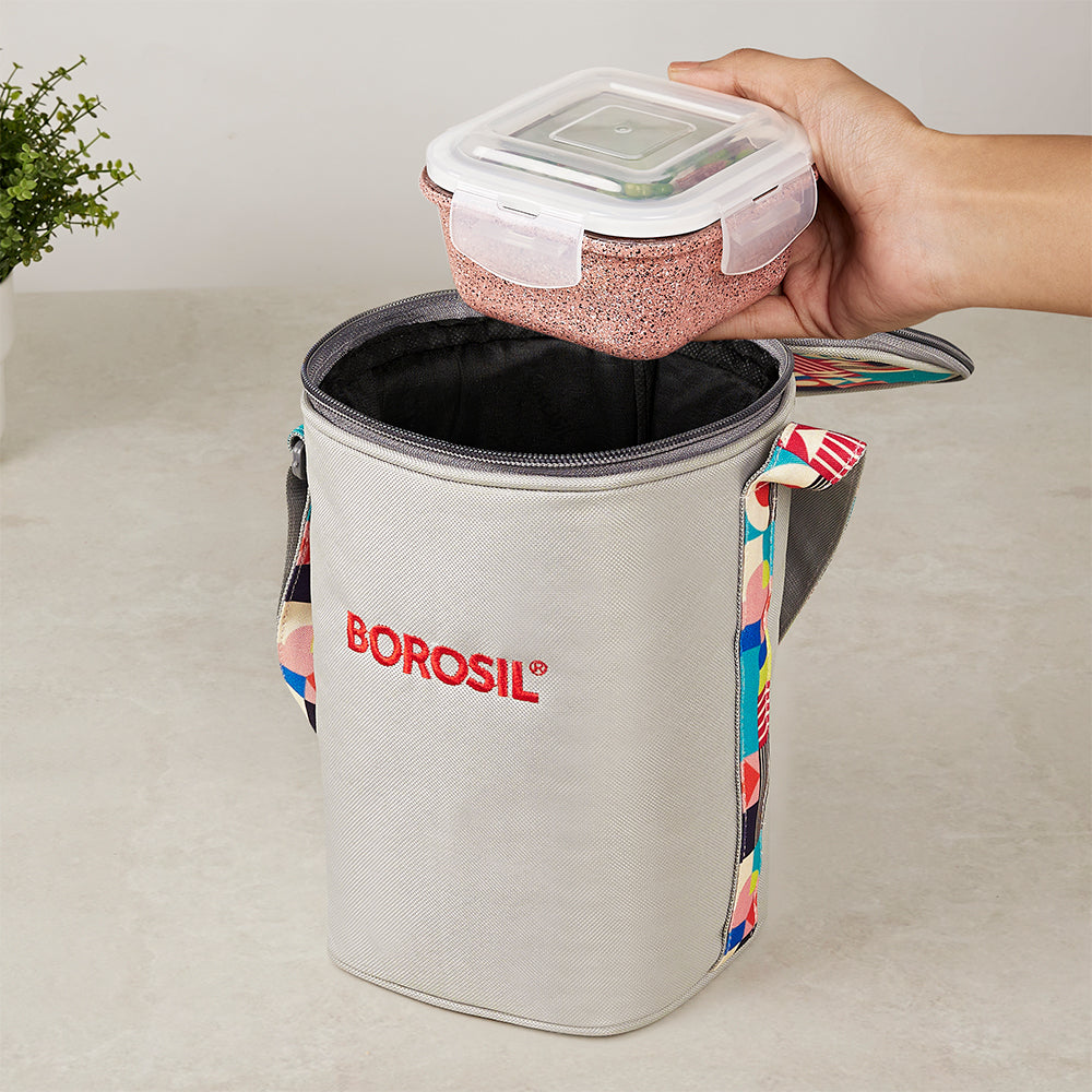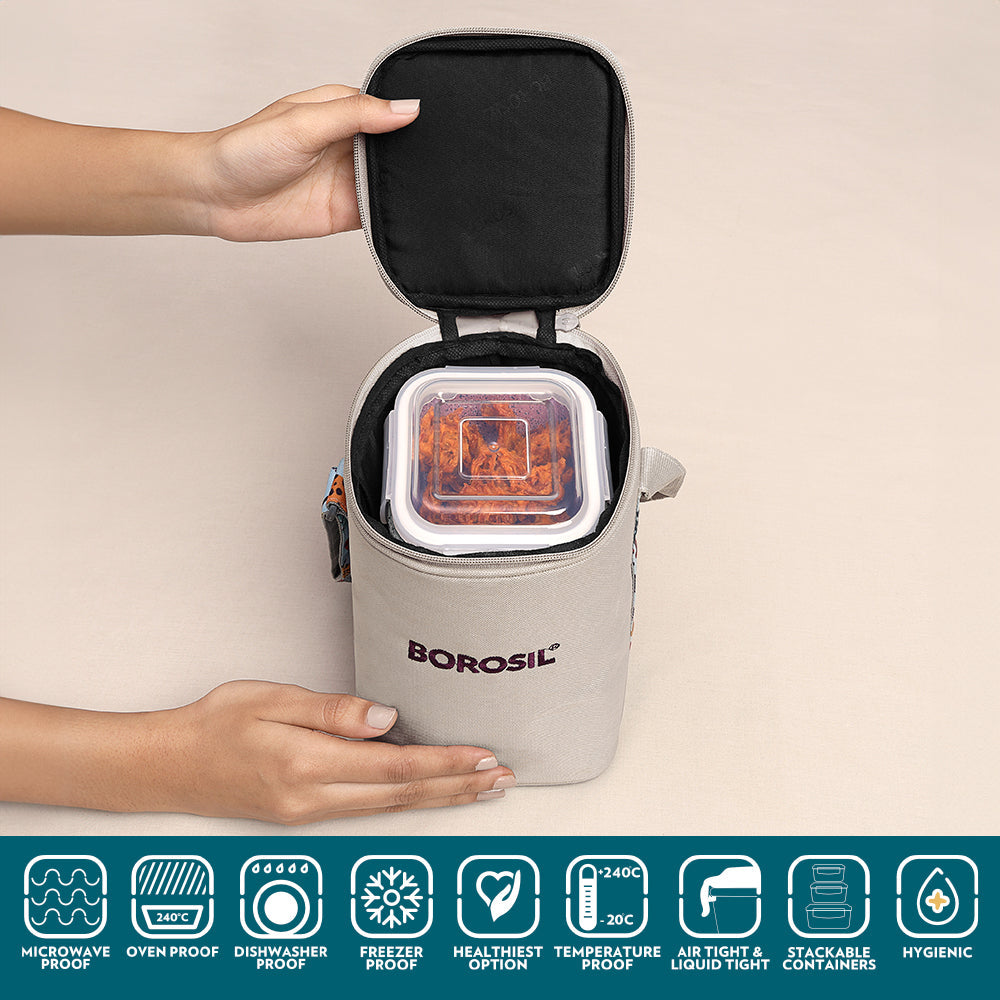 Fresh, tasty and healthy our Borosil Lunch Boxes ensure that your food looks, tastes and smells just as it did while it was lovingly prepared. Made of the finest borosilicate glass, the leak proof boxes are 100% microwavable (up to 350°C) and 100% stain proof and leach no chemicals into your food. Unlike the other glass lunchboxes in the market, Borosil's Lunchbox range is made of high grade borosilicate glass, which is also oven safe. The high quality fabric carry bags are machine washable. There is no better way to bring home to the office. No plastic - isliye fantastic!
