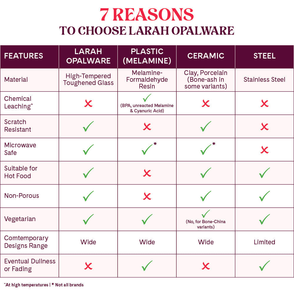 Larah products are lightweight, yet extra strong, and can withstand rough usage without chipping or scratching - so they always look as good as new. They are also microwave and dishwasher safe, making them a convenient daily use option. The beautiful designs are perfect both for special occasions, and to make everyday special!