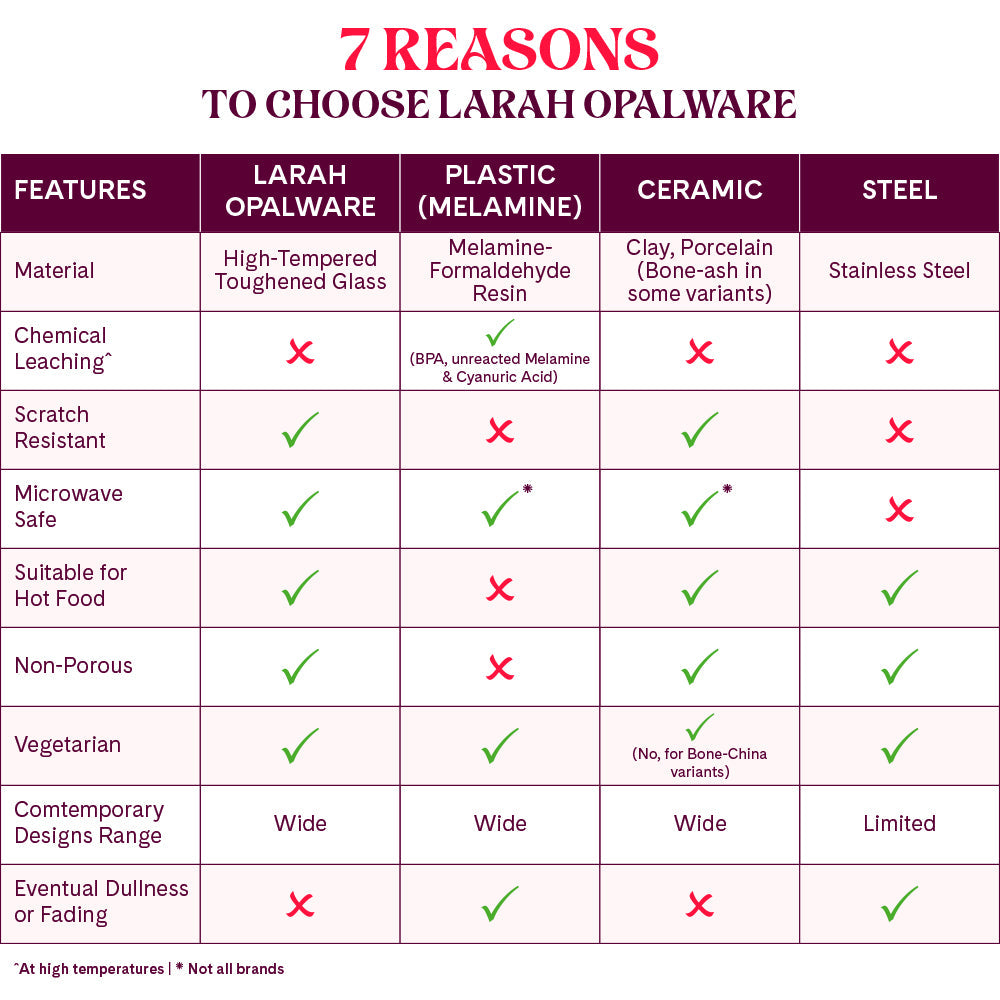 Larah products are lightweight, yet extra strong, and can withstand rough usage without chipping or scratching - so they always look as good as new. They are also microwave and dishwasher safe, making them a convenient daily use option. The beautiful designs are perfect both for special occasions, and to make everyday special!
