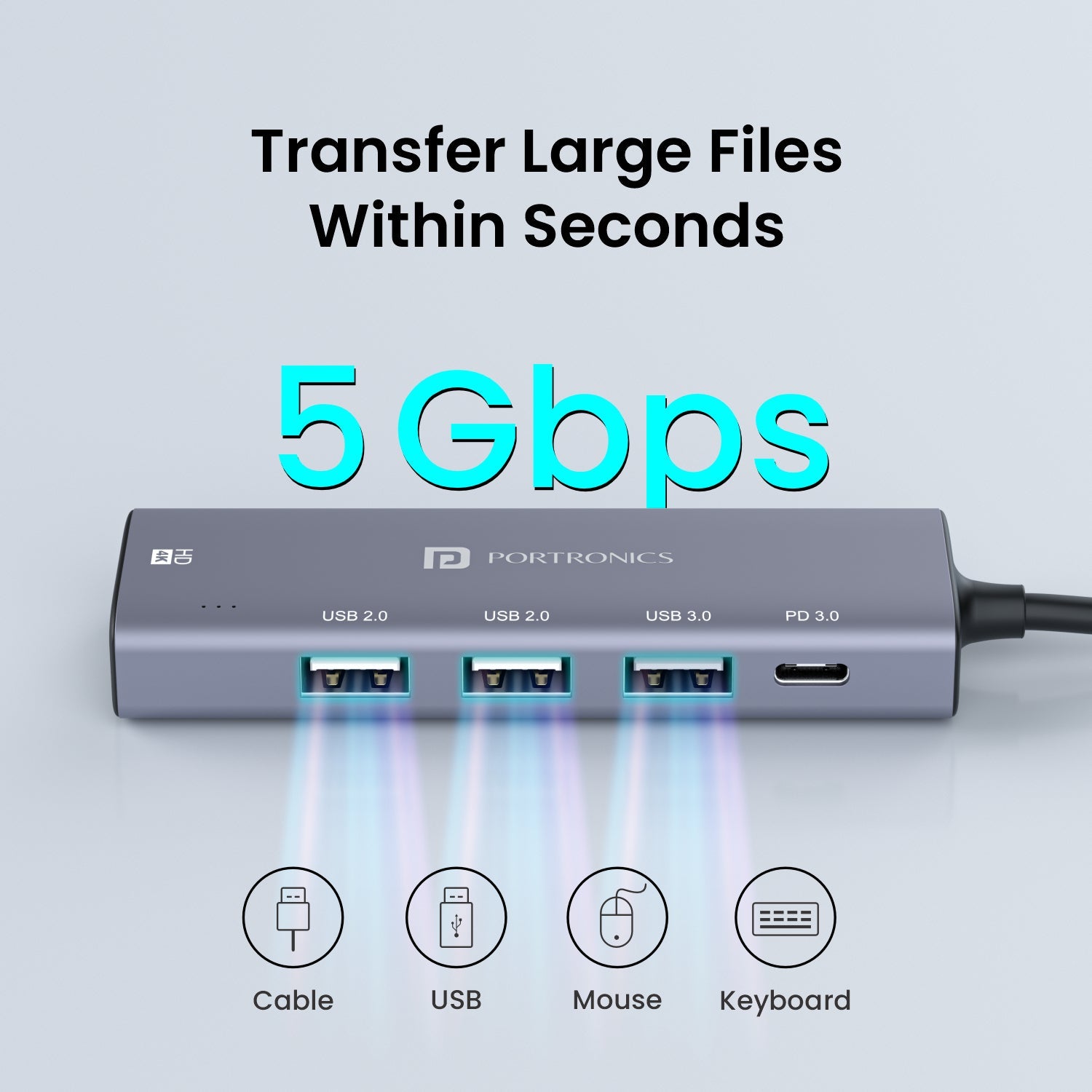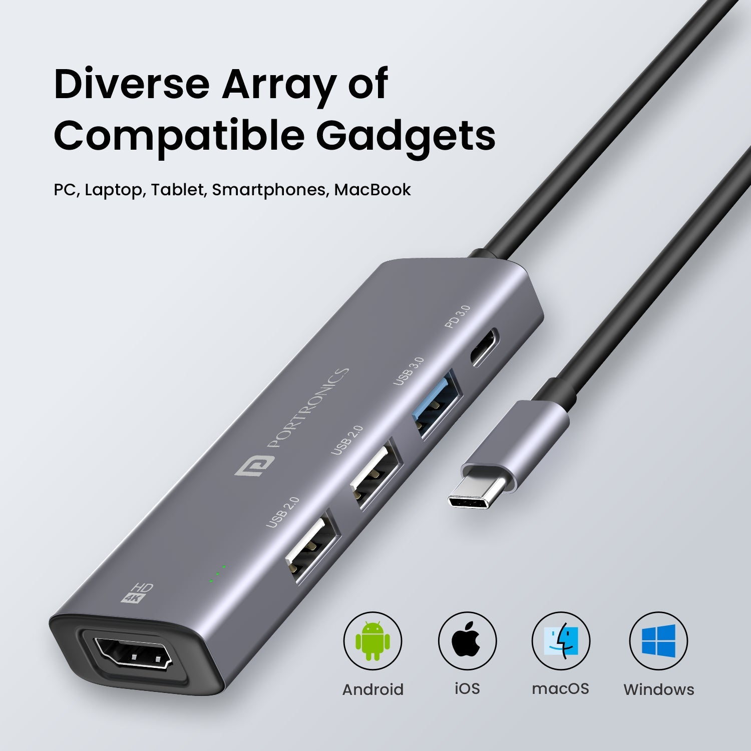 - 5-in-1 USB-C Hub: The Portronics Mport 32, a USB-C hub is the ultimate multitasker with an HDMI port, 2 USB 2.0 ports, a USB 3.0 port, and a USB-C PD charging port.