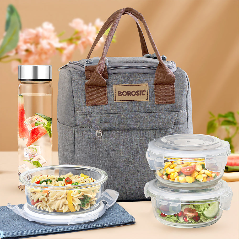 Our Pro Lunch box set comprising 3 round glass lunch boxes and a glass water bottle is the perfect solution for those who want to pack a healthy and delicious lunch on the go. The lids on the lunchboxes are airtight to keep your food fresh and secure and are also leak proof so there is never any mess in your carry bag. The boxes are made of borosilicate glass so they are microwave and dishwasher safe. The set also comes with a convenient carry bag, making it easy to transport your lunch to work, school, or wherever you may be headed. The bag is made of a durable material that can withstand the wear and tear of daily use. To complete the set, there is a sturdy glass water bottle included, perfect for keeping you hydrated.