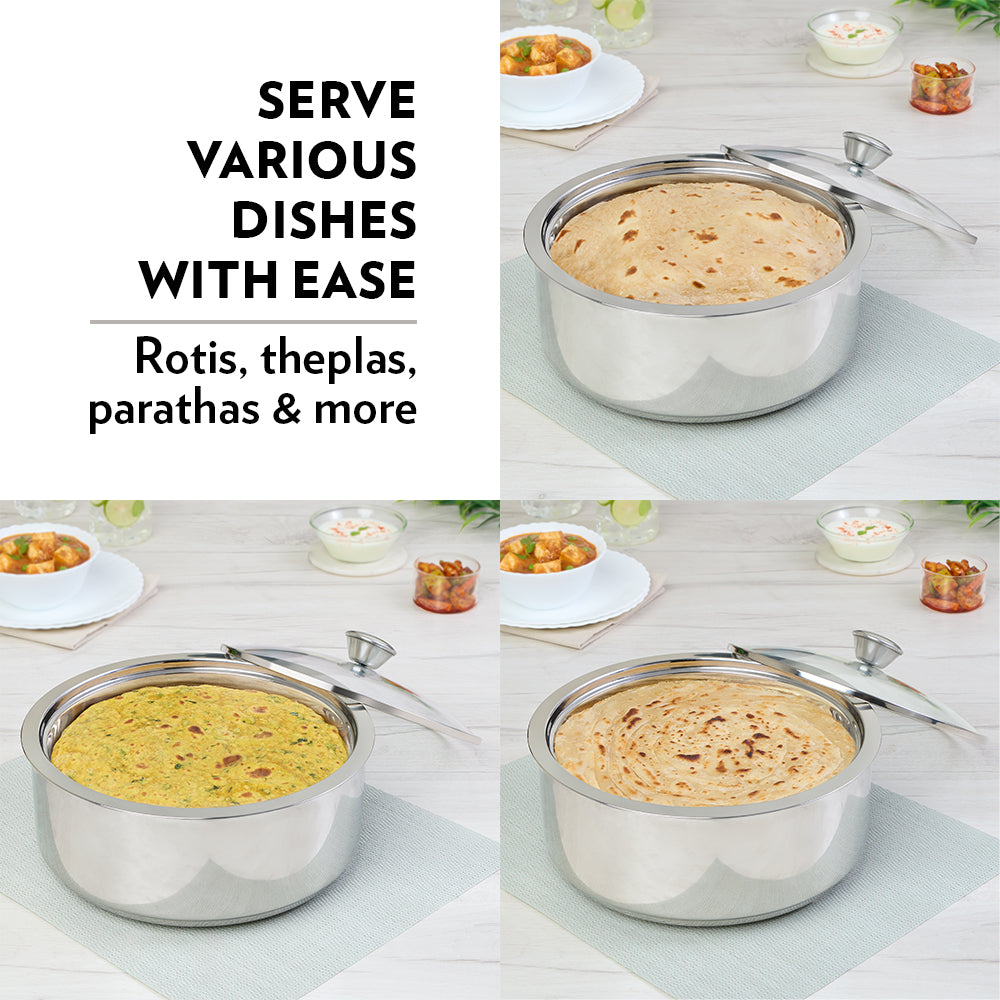 The ServeFresh Insulated Roti Server is designed to ensure freedom from roti sogginess! The double-walled PUF insulation retains the nutritive value of the food. And the dome-shaped lid on the casseroles ensure that the condensed steam trickles down the sides and slides below the coaster, without dropping on the rotis / idlis / theplas, ensuring they stay retain the flavour and aroma, and stay perfectly fresh.
