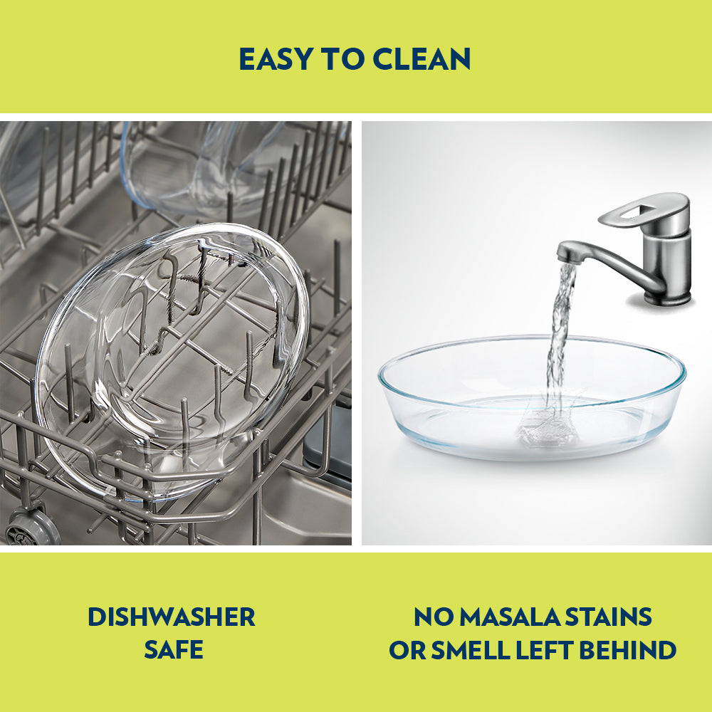 The oval baking dish is perfect for baked dishes, lasagnas, raviolis, au gratins, pulaos, sabzis, and items such as rasmalais, rasgullas, gulabjamuns and dahibadas, which are best spread out flat. Made of 100% borosilicate glass which retains its crystal clarity over repeated usage, this oval dish is perfect for adding a flair of design to your table.