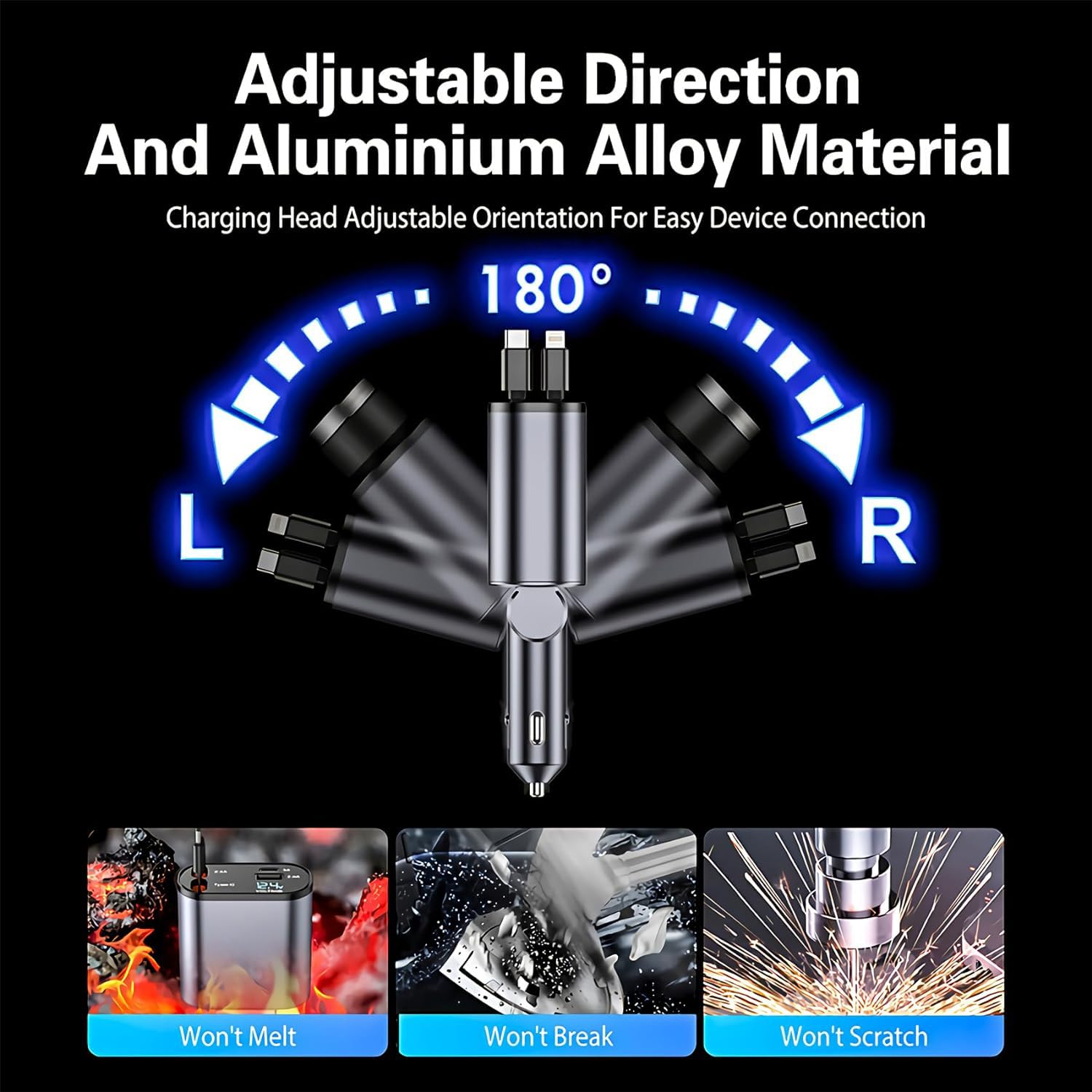 This versatile accessory is designed for convenience, featuring a retractable cable and four connector options to handle all your devices with ease.