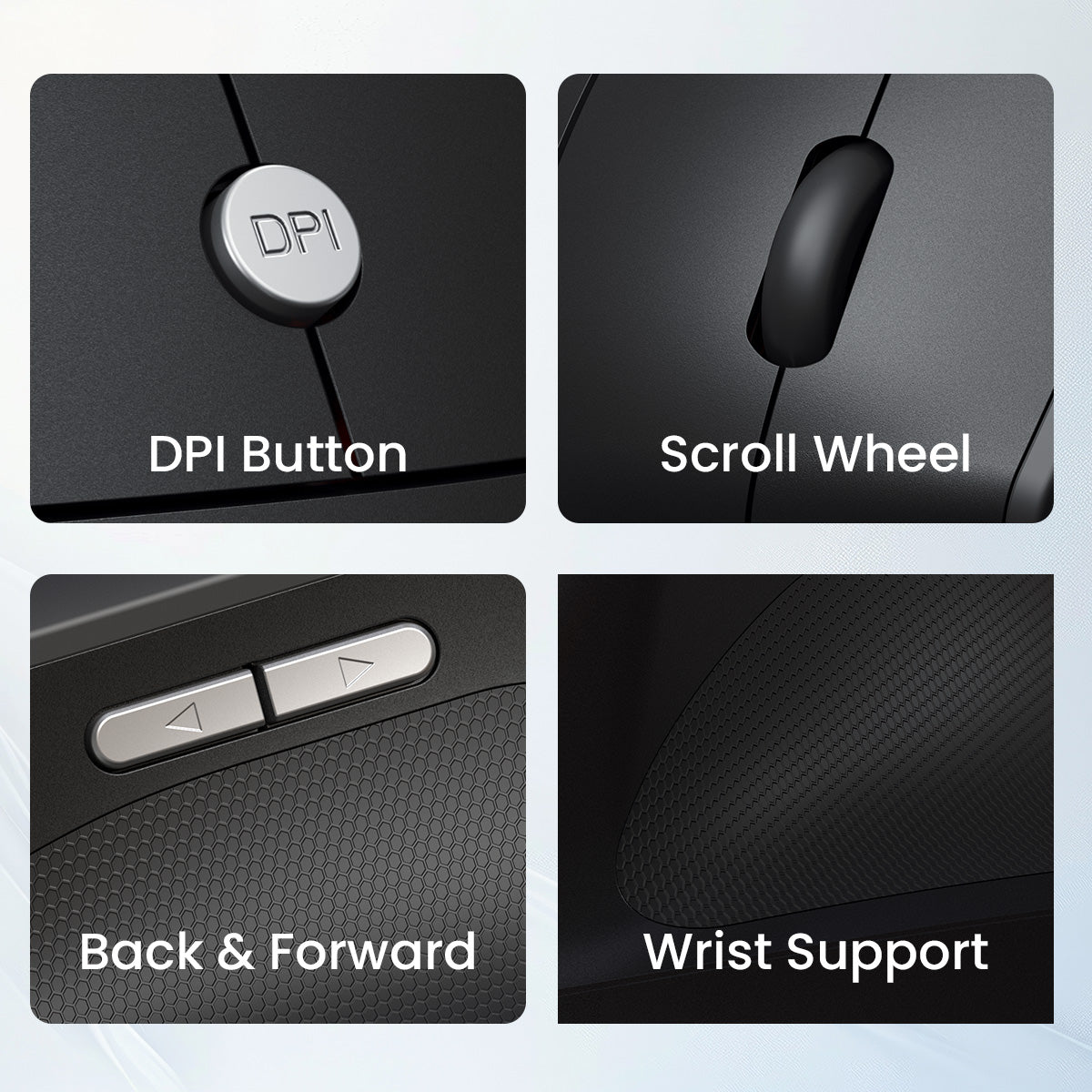 6D Buttons: The button design is a mix of traditional and modern sensibilities, the 3 buttons Left, right and scroll wheels that is super sensitive and register all clicks and scroll. The DPI button to adjust cursor speed and 2 buttons on the left to go forward/backwards while working on an application or while browsing.