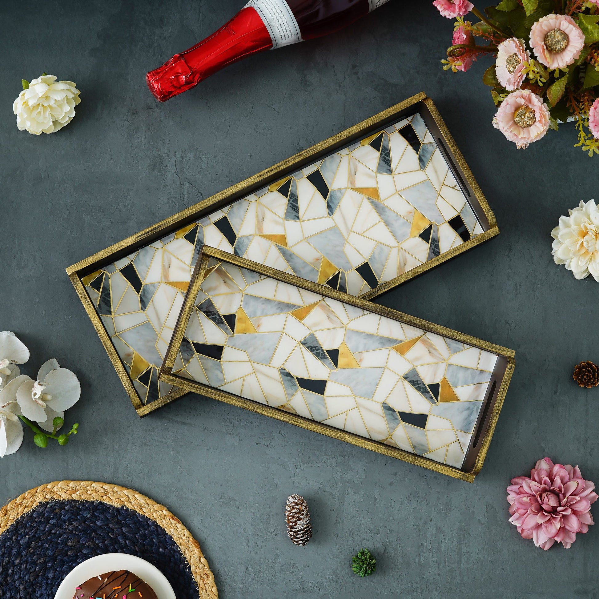 Webelkart Beautiful Handmade Marble Printed Wooden Serving Tray Enamel Coated for Home/Office Decor Serving Tray Set of 2, Trays,Coffee Tray Home Decorative Item (12",15" Inches)