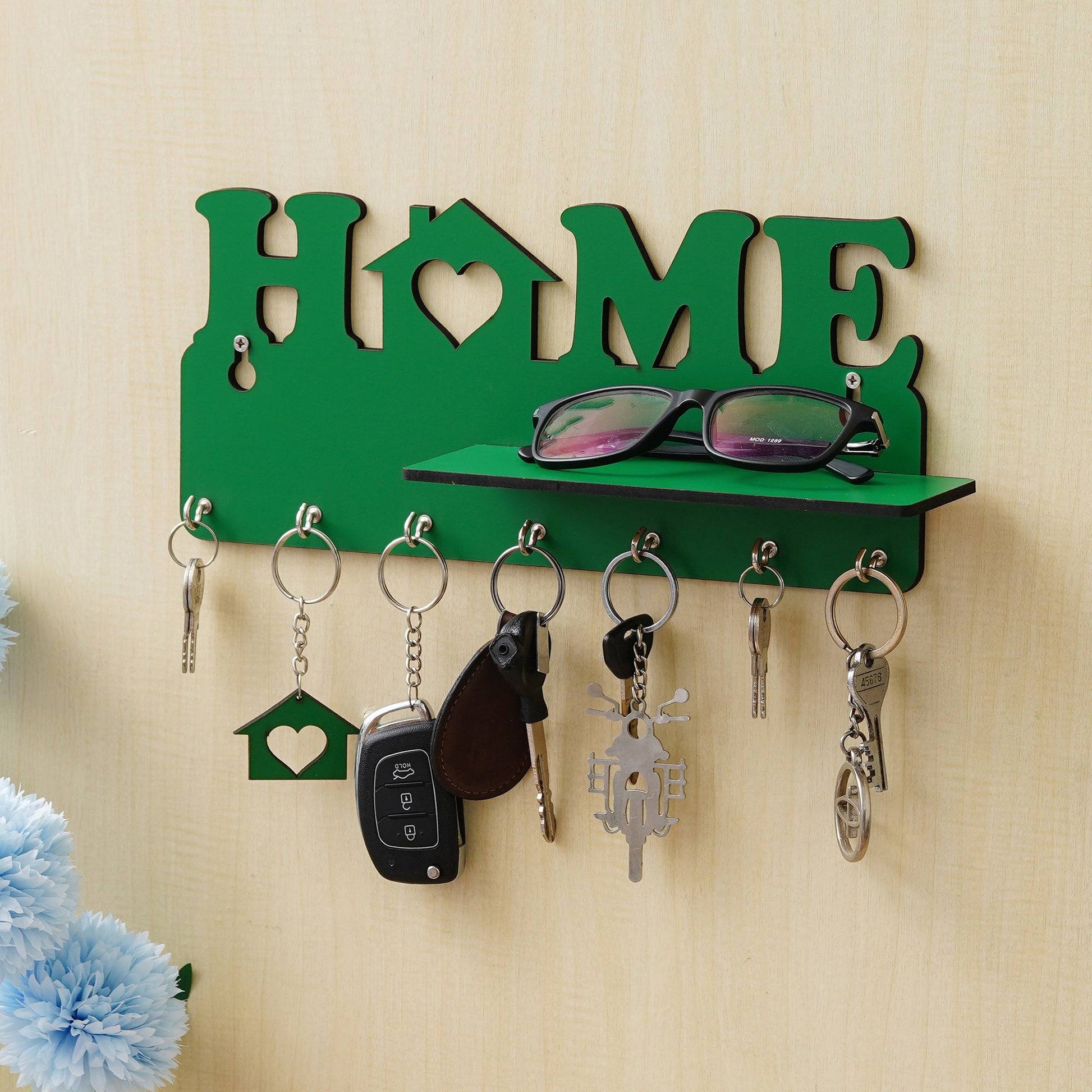 Webelkart Designer Home Keys Wooden Key Holder with 7 Hooks, Free Keychain (29 cm x 13.5 cm x 0.4 cm, Green) Key Stand Key Hanger