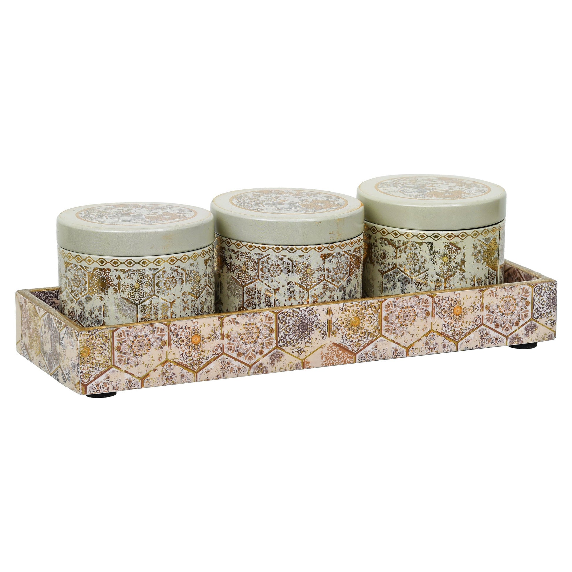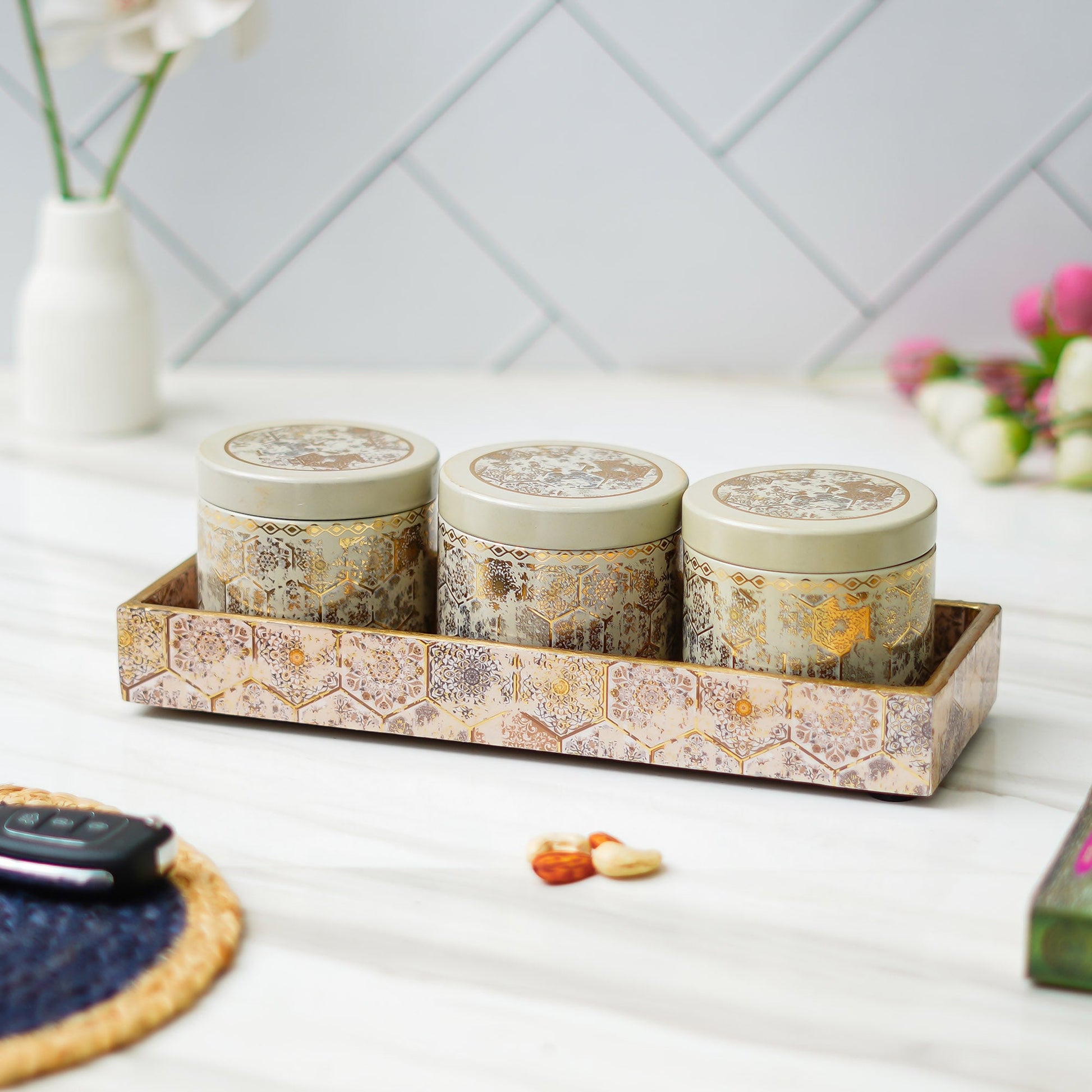 - Package Contents: Printed 3 Jar Dry Fruits Container With 1 Tray Home/Office Decor Table Decor Item