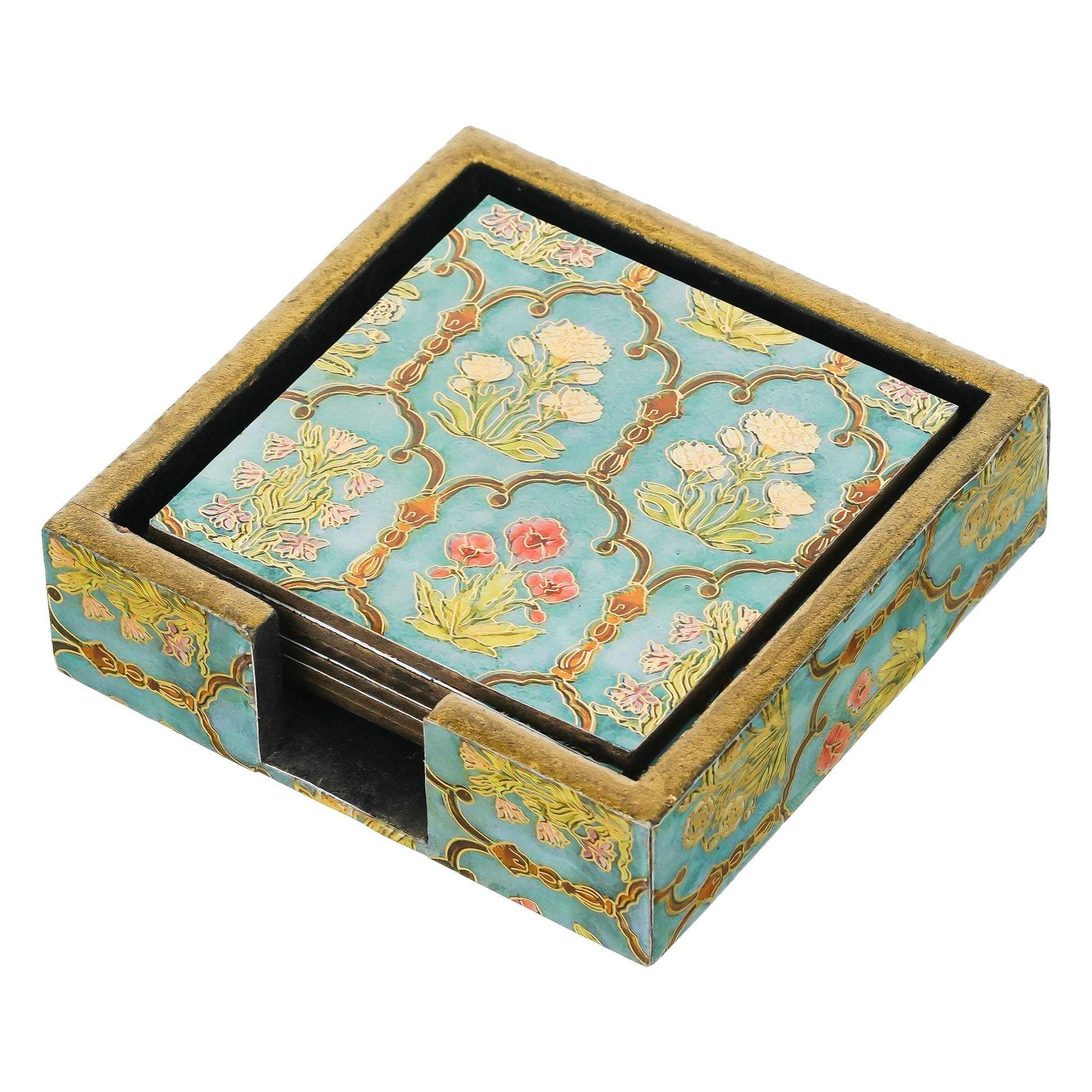 Webelkart Premium Enamel Coated Wooden Coaster Natural Printed Handmade Square Tea Coasters with Stand Tea/Coffee Coasters,Coster Set for Dining Table for Hot Pots Home Decoration Item (5" Inches)