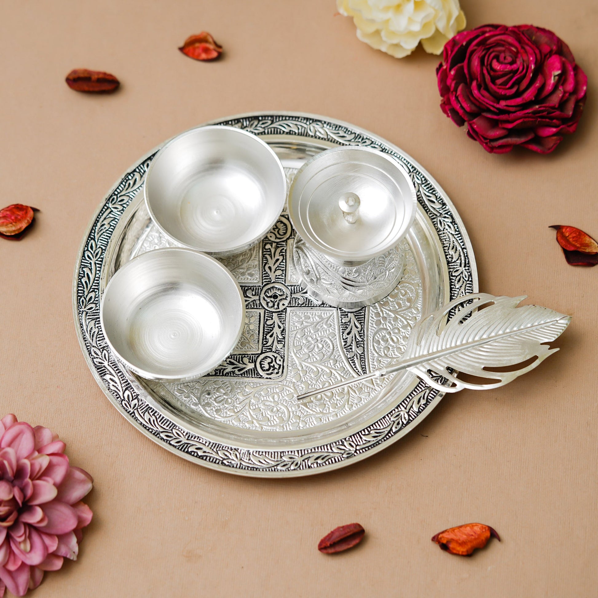 Webelkart Premium Silver Plated Swastik Pooja Thali Set with Velvet Box for Diwali Poojan/Pooja Room/Diwali Gifting |ReturnGift,Thali Set for Puja.( 8" Inches)